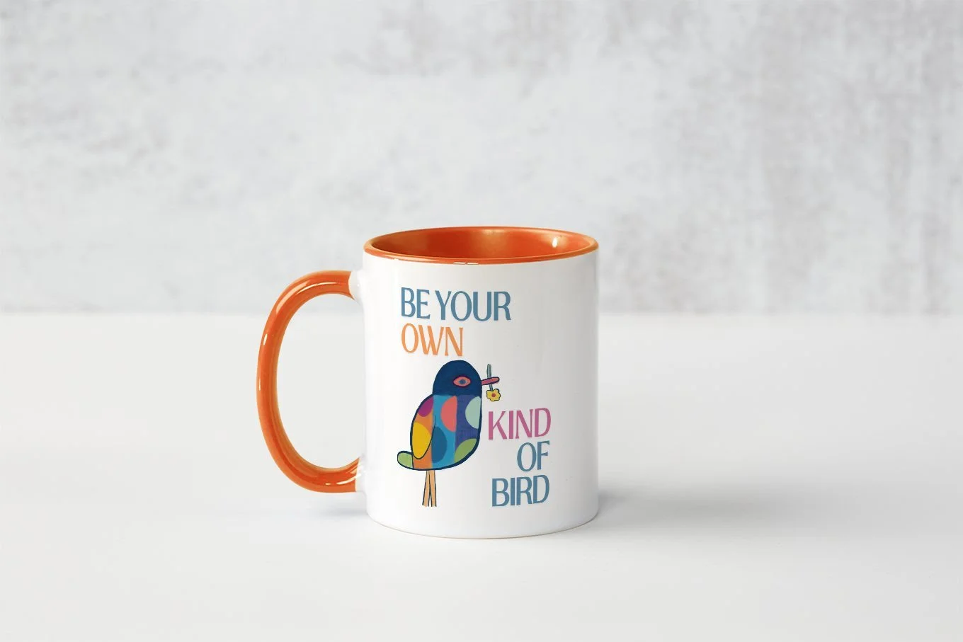 Our illustrated design on a (325 ml) durable ceramic mug with a bright orange inside. Be Your Own Kind of Bird!